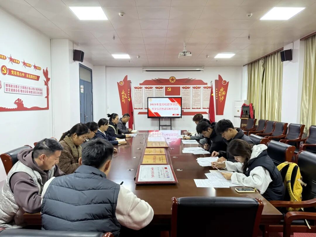 为切实落实高校资助政策,强化学生诚信意识,助力体院学子在逐梦路上轻装上阵,11月7日,体育学院“诚信立根本 资助助远航”2025年高校助学贷款签字仪式暨诚信教育主题活动在党员活动室隆重举行。体育学院党支部书记刘河杉、学管办主任方睿、全体辅导员老师及本年度贷款学生参加本次签字仪式,共同筑牢诚信基石,共话成长未来。仪式由方睿老师主持。