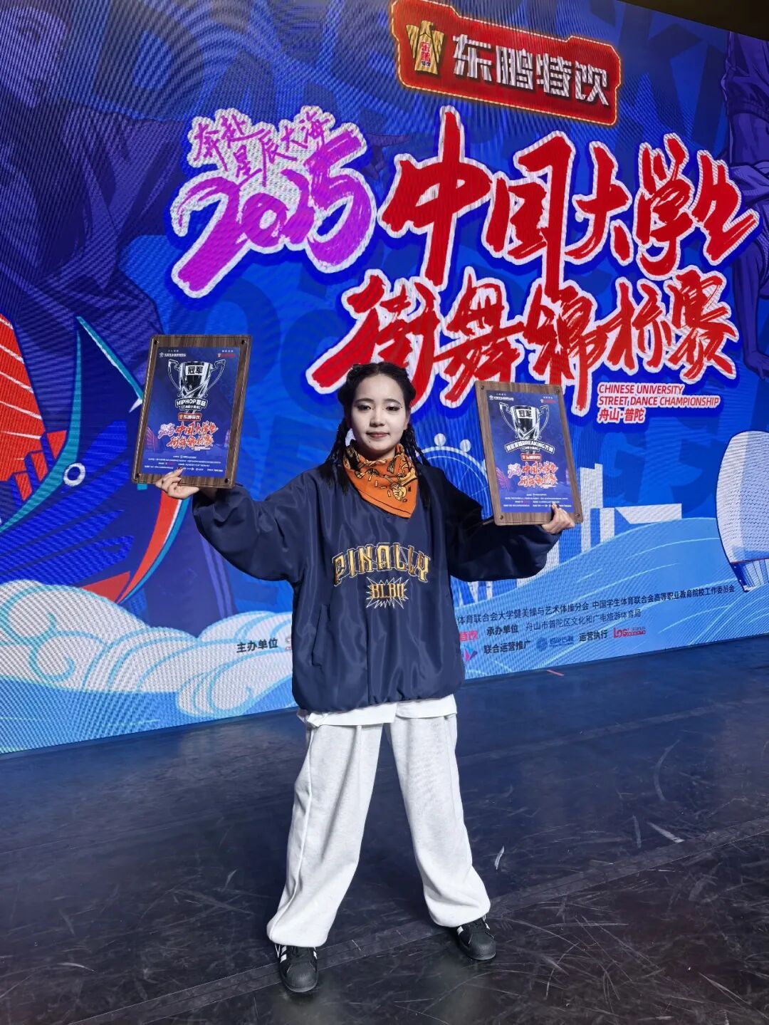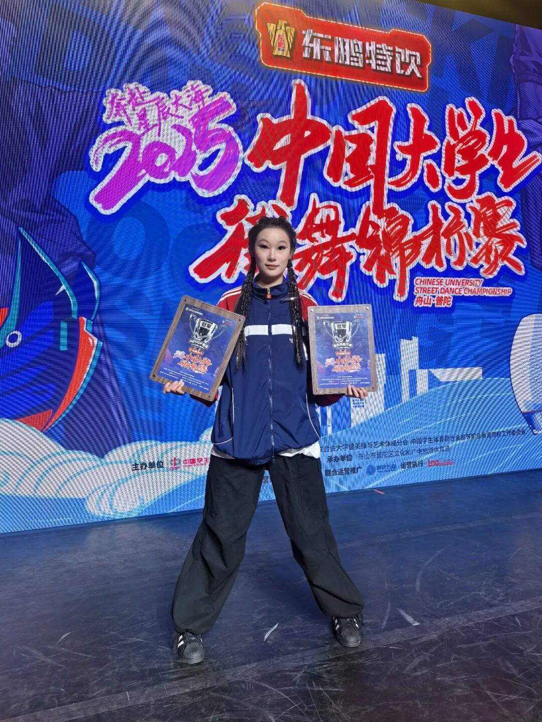 今天能在中国大学生街舞锦标赛上斩获三项第一名,我想说:热爱可抵岁月漫长,汗水终会浇灌荣光!特别感谢我的学校——信阳职业技术学院体育学院!是学院的支持,让我能毫无后顾之忧地奔赴赛场,把在校园里练出的本领,在全国赛的舞台上尽情展现。感谢老师们的谆谆教诲,你们不仅教会我体育专业的理论知识,更教会我“全力以赴”的拼搏精神;感谢我的教练,是你陪着我一遍遍抠动作、磨细节,陪我熬过无数个枯燥的训练日。没有你们,就没有今天的我!青春逢盛世,奋斗正当时!未来我会继续跳下去,让更多人看到信阳职院体育人的风采!