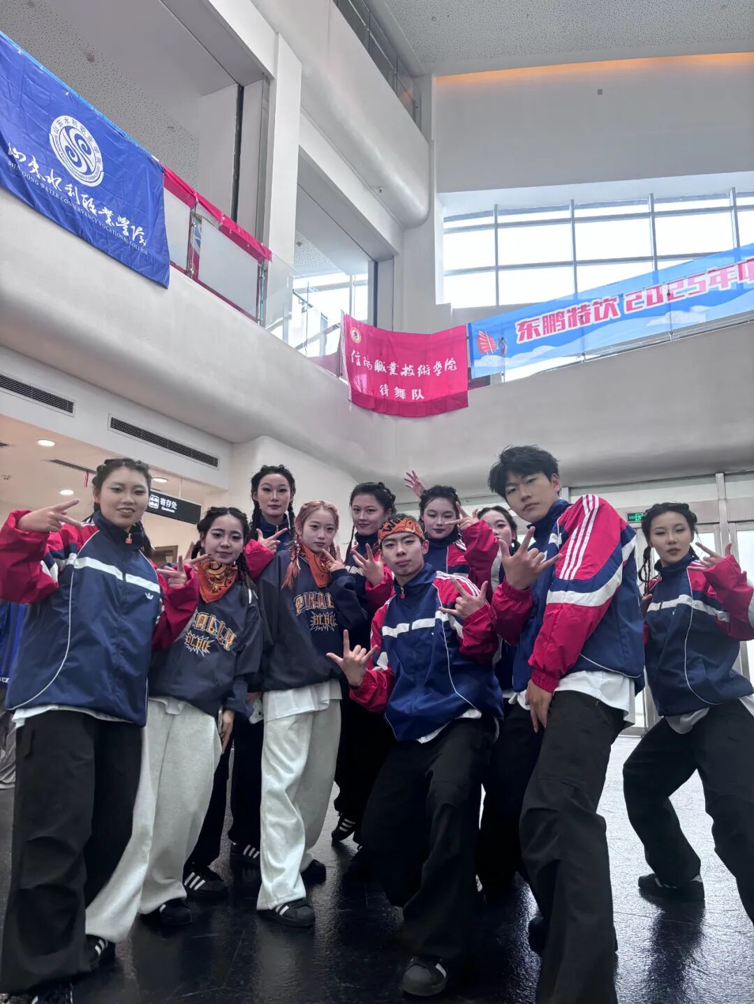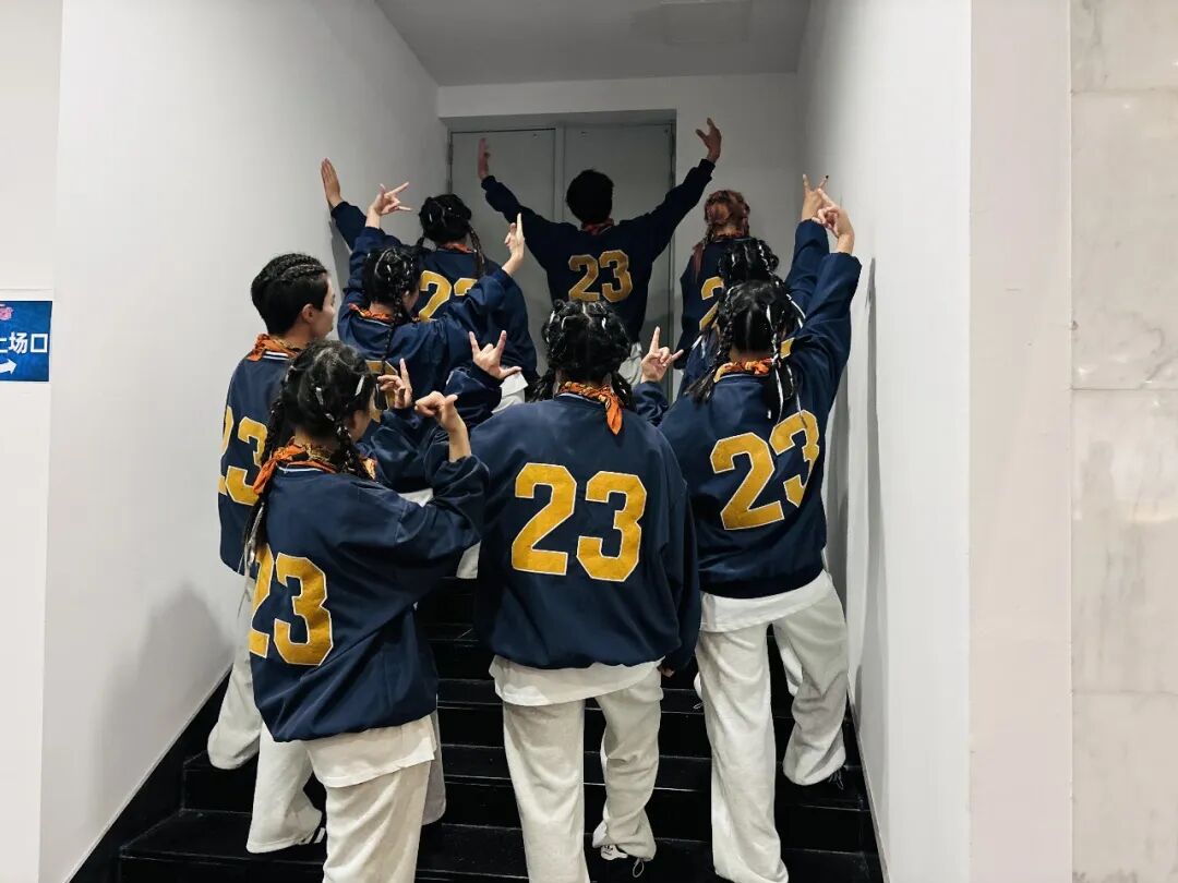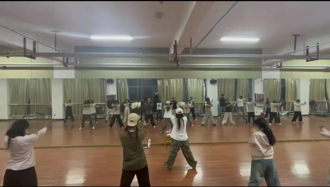 没人知道,这块“三连冠”的奖牌有多沉。备战的日子里,练功房就是我们的第二个课堂。每天上完专业课,我们便马不停蹄地赶来集合,从傍晚练到深夜,是我们的常态。Hip Hop的节奏要卡到分毫不差,我们就把音乐拆分成小节,逐拍练习;Breaking的力量动作难度大,我们就互相保护、反复冲刺,哪怕膝盖撞出淤青,手臂练到酸痛也不放弃;集体齐舞的队形衔接要丝滑,我们就对着镜子一个个调整位置,记住每一个队友的节奏与步伐。训练累到极致时,有人会靠在墙边喘口气,但只要音乐再次响起,大家又会立刻精神抖擞地站回原位。因为我们知道,我们不是一个人在战斗,身后是整个团队的信任与期待。
