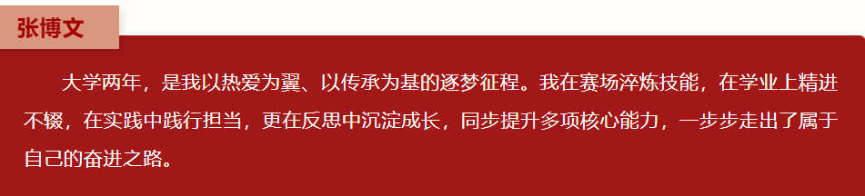 大学两年的时光,我收获的不仅是沉甸甸的奖牌、荣誉证书与奖学金,更在一次次赛场竞技、学业钻研与实践探索中,全面提升了专业技术水平、融合创新能力、沟通协作能力、教学引导能力与问题解决能力。这段旅程让我读懂了坚持的意义——所有成绩的取得都源于日复一日的打磨;读懂了责任的重量——无论是作为参赛者、教练、志愿者还是教学者,都需以敬畏之心对待每一份使命;更读懂了传承的价值——非遗不是静止的遗产,而是可与现代生活、现代技能深度融合的鲜活力量。这些能力与感悟已成为我内心最坚实的力量,支撑着我未来继续以热爱为帆、以责任为舵,在文化传承与个人成长的道路上笃定前行,书写更加精彩的人生答卷。