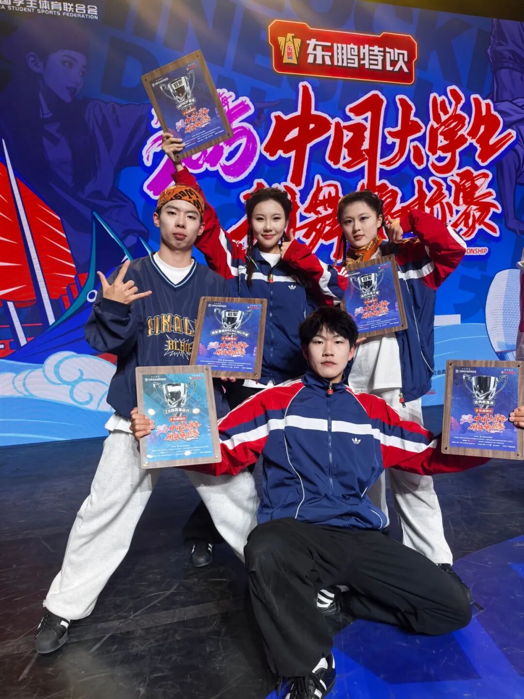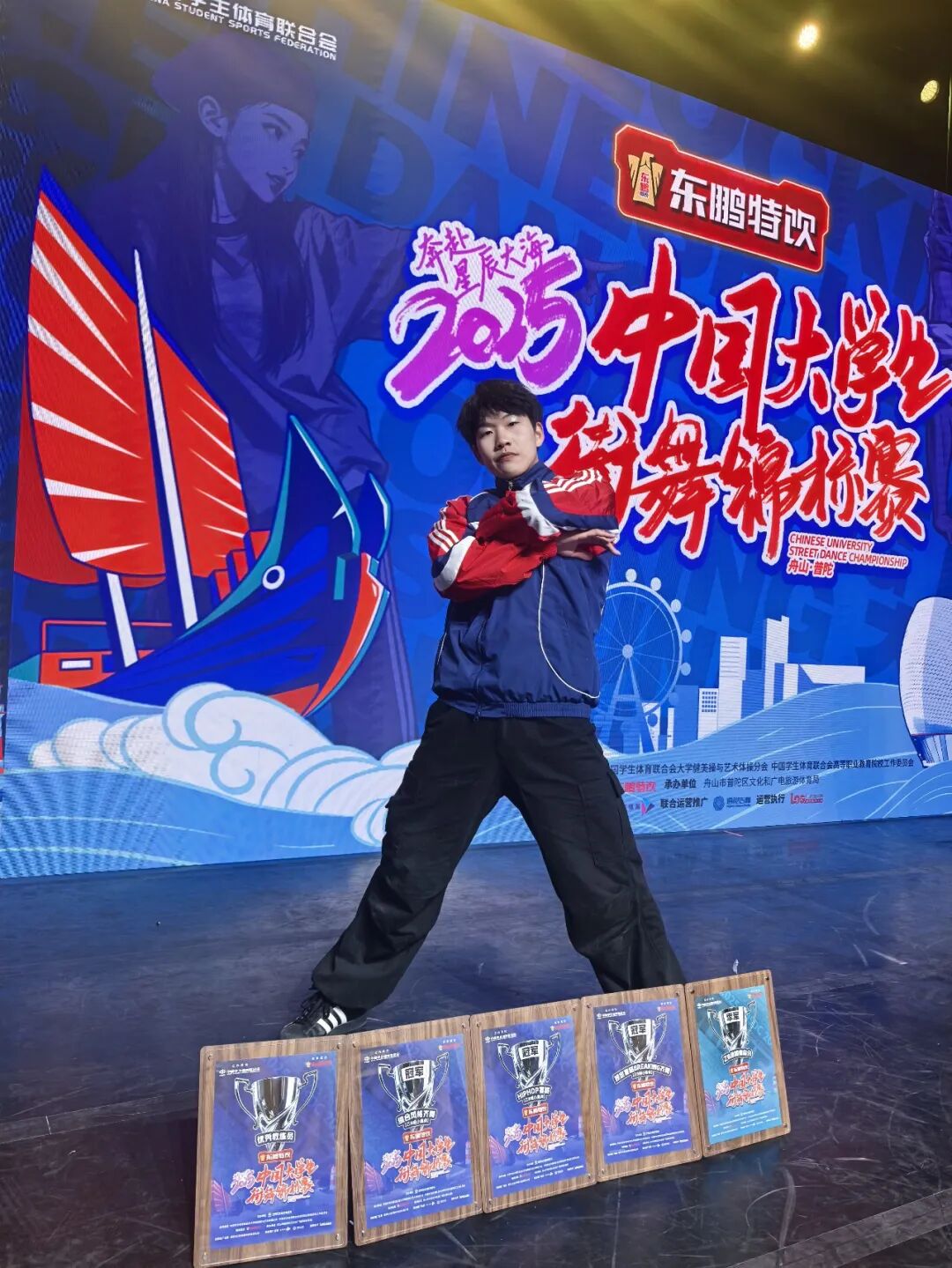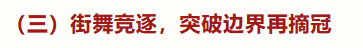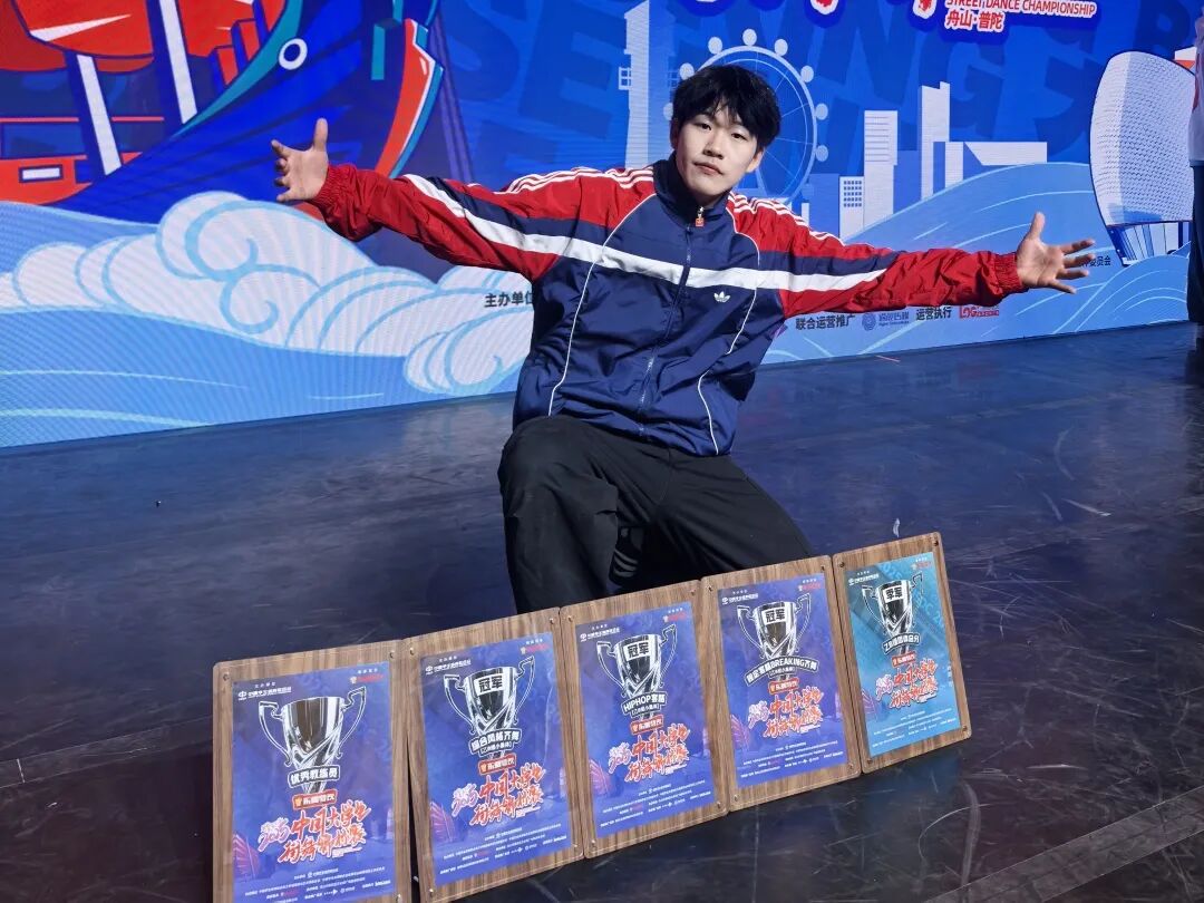 大二上学期,经过一年半的积累与沉淀,我得以入选全国大学生街舞锦标赛参赛队伍。为实现自我突破,我主动拓展舞种边界。街舞指导老师耐心帮我纠正发力误区,引导我深入挖掘非遗元素的创新应用,还鼓励我将过往赛场经历融入编舞创作。我反复观摩钻研顶尖舞者的视频,在老师的悉心点拨下不断优化动作细节。最终,我一举拿下三项冠军,更加坚定了“以热爱为舟,行稳致远”的信念。在此过程中,我的创意策划与团队沟通协作能力得到进一步提升,学会了在团队中高效整合各方意见,推动创意想法落地生根。