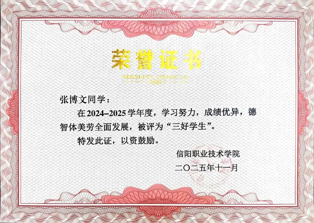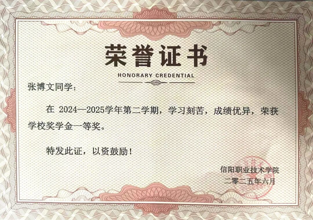 在深耕专业技能、征战各类赛场的同时,我在学业上始终丝毫不敢松懈。凭借较强的自主学习能力与高效的时间管理方法,我的成绩连续两年稳居班级第一,成功斩获学校一等奖学金与国家励志奖学金。这份荣誉让我真切体会到“一分耕耘,一分收获”的深刻内涵,更在兼顾高强度备赛与繁重学业的过程中,锤炼出扎实的时间管理、高效执行与多任务处理能力。这段历程也让我清醒认识到:优秀者更需保持谦逊精进的态度,而在学业与兴趣之间找到最佳平衡点的过程,进一步强化了我的自我驱动能力,为未来的多元发展奠定了坚实基础。