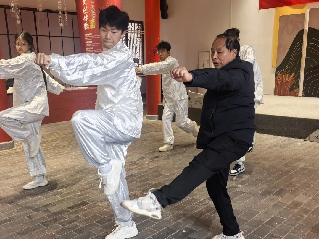 师生党员们以“非遗推广志愿者”的身份积极投入,主动请教教学难点,反复打磨动作细节,凭借扎实的体育专业功底,快速掌握了基础招式的核心要领。汪师傅对此频频称赞,直言:“体育学院的同学们专业素养高、领悟能力强,对动作发力的把控很精准,有你们助力,汪家拳进校园肯定能事半功倍!”现场既洋溢着严谨的学习氛围,更彰显了党员带头传承非遗的责任担当。